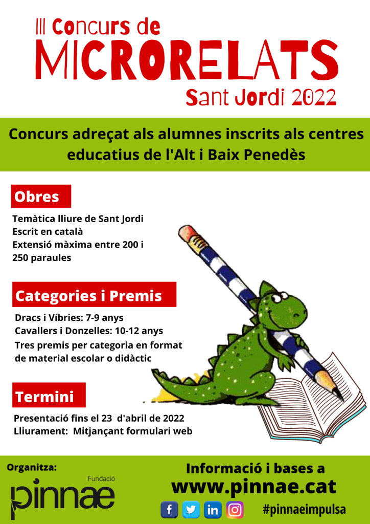 La Fundació Pinnae impulsa per tercer any, el Concurs de Microrelats per aquest Sant Jordi 2022 que va dirigit als alumnes de primària de les escoles de l’Alt i Baix Penedès.
