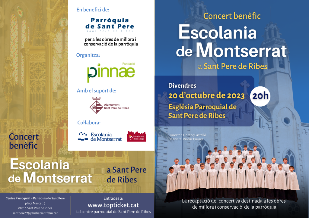 La Fundació Pinnae organitza el pròxim 20 d’octubre a les 20h a la Parròquia de Sant Pere de Ribes, un concert de l’Escolania de Montserrat en benefici de les obres de millora i conservació de la parròquia.