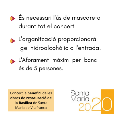 L’aforament per cada un dels concerts serà al voltant del 50% de la Basílica, fet que garanteix un distanciament i que les mesures de seguretat es compleixin degudament. Per l’accés a l’interior de la Basílica serà obligatori l’ús de mascareta i es servirà de gel hidroalcòholic a tothom per la desinfecció de mans. El distanciament del públic anirà amb una limitació obligatòria de 5 persones per banc.
